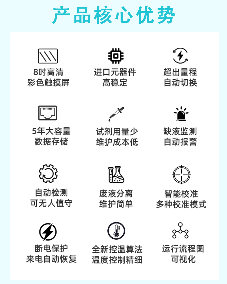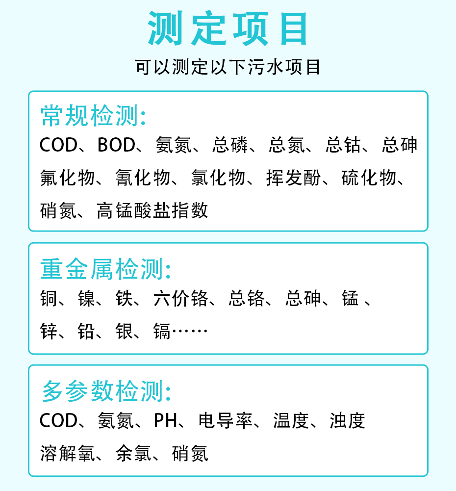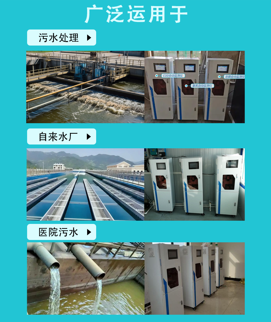 該分析儀能夠根據(jù)現(xiàn)場設定長期無人值守自動連續(xù)工作,廣泛適用于工業(yè)污染源排放廢水、工業(yè)過程工藝廢水、工業(yè)污水處理廠污水、市政污水處理廠污水等場合。根據(jù)現(xiàn)場測試工況的復雜程度,可選配相應的預處理系統(tǒng),以保證測試過程可靠、測試結果準確,充分滿足不同場合現(xiàn)場需求。